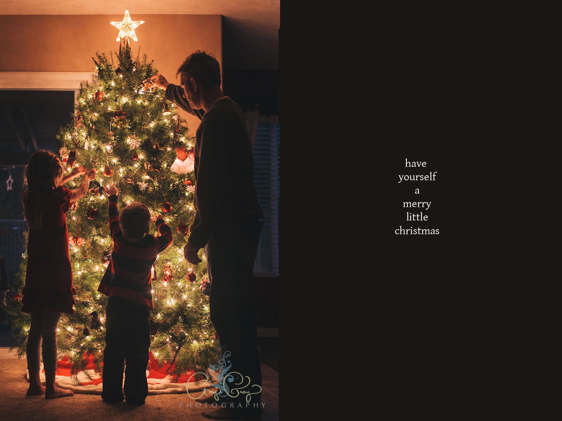 Christmas trees, take two! Our family tradition has always been to get our family room “main” tree from the local tree lot across the street from our church, and this last Sunday afternoon, while we were lazing around on the couch, Rod and I had the brilliant idea to go get the tree. So we did. The kids were all about it. We were all in splendid moods, and we found the perfect tree. Then Rod chopped off the bottom of the trunk, I spread out the plastic, and the kids made themselves scarse (in some way that, miraculously, did not involve messing up the house). We brought in the tree to the sounds of Amy Grant’s “Tennessee Christmas” and the smell of a cinnamon candle. THIS was how it was supposed to be. We sifted through the ornaments and talked about the times when we received them. We only dropped and broke two. And then, I took this photo. As a friend said, “Norman Rockwell is smiling down.” Ha ha! But yes, that was the way I felt that day, and I’m so glad I have the image to remember it by. Merry Christmas from the Gray Family!
