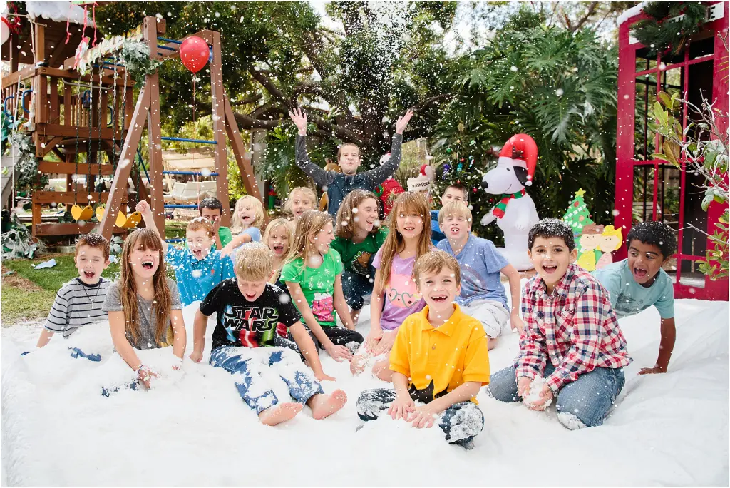 Papa’s Park is always the perfect venue for a kids’ party, complete with zip-line, playhouse, jungle-gym, and spinning ride . . . but we kept the faux snow a secret from Steven until just a day ahead of time. The snow really made the whole backyard a realistic winter wonderland! The kids had a blast throwing snowballs, dumping snow on each other, and sliding around in it. The falling snow (snow bubble solution) brought renewed excitement every time Papa started it up again. These Southern California kids don’t see a lot of snow, and this was a typical winter day in San Diego . . . sixty-eight degrees.