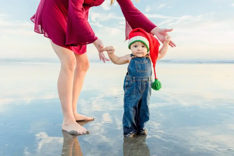 The Santa hat, the overalls, the glassy shore and cloud-puffied sky. Is this not the sweetest thing ever? I love this mom and her vision for her Christmas session this year!