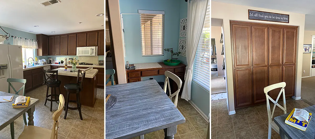 In my next post, I’ll tell you about the cabinet solution — we have a BIG kitchen and were on a budget, so it was an adventure! But for now, check out the before-and-after of the office and living room spaces that I sent to Joy when the flooring was in and the paint was done. My big office dresser wasn’t even off casters yet, but I was so excited by the way everything turned out that I couldn’t help but jump the gun and send her an “after” video. More about Joy in the next post, too.