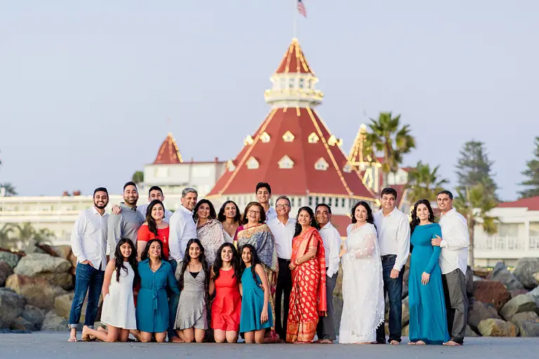Anjali’s extended family session on a bright, sunny day in late December was one of the biggest I’ve done, so I asked my sister Melanie to give me a hand. Between the two of us, we shot as many images as we might have for a full-day wedding. Twenty-four people is about twice the number of people in a typical extended family session, so we were both busy, running all over the beach and working hard to get all of our combinations and poses. Scroll down for Melanie’s behind-the-scenes shot of me shooting one of the largest groupings.