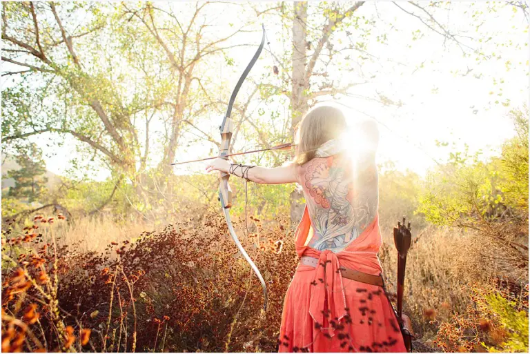Shortest photo session ever, with absolutely the most prep time. We may be (ahem) in our late thirties, but we still like to play, and my uber-talented friend Erin (of ChoirBox) and I had been brainstorming this session ever since she decided to cover over her previous (less awesome) tattoo with some serious art* (don’t try this at home, kids). Erin has a way with a bow and arrow, and she even MAKES these things . . . plus quivers and all sorts of other leather items. We felt that she should definitely design and sew herself an amazing dress to showcase the tattoo, commission a custom archery target made of natural woven fibers, and head out to the nearest field to take some good photos.
